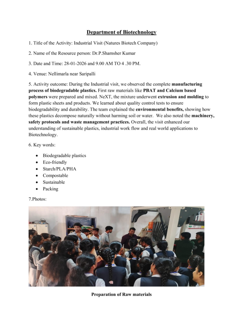 Students of the Department of Biotechnology explored the manufacturing process of biodegradable plastics, learning about eco-friendly materials, quality control, safety practices, and sustainable industrial workflows during an industrial visit on 28.01.26