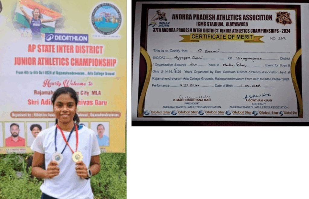 1 | S Sravani | 400m Running | State | Second | Individual | 4th – 6th Oct-24 | Vijayawada |