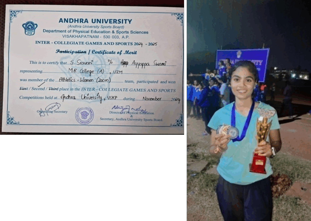 11 | S. Sravani | 200 Mts | Inter Collegiate | Silver | Individual | 2nd – 24th Nov-24 | Visakhapatnam |