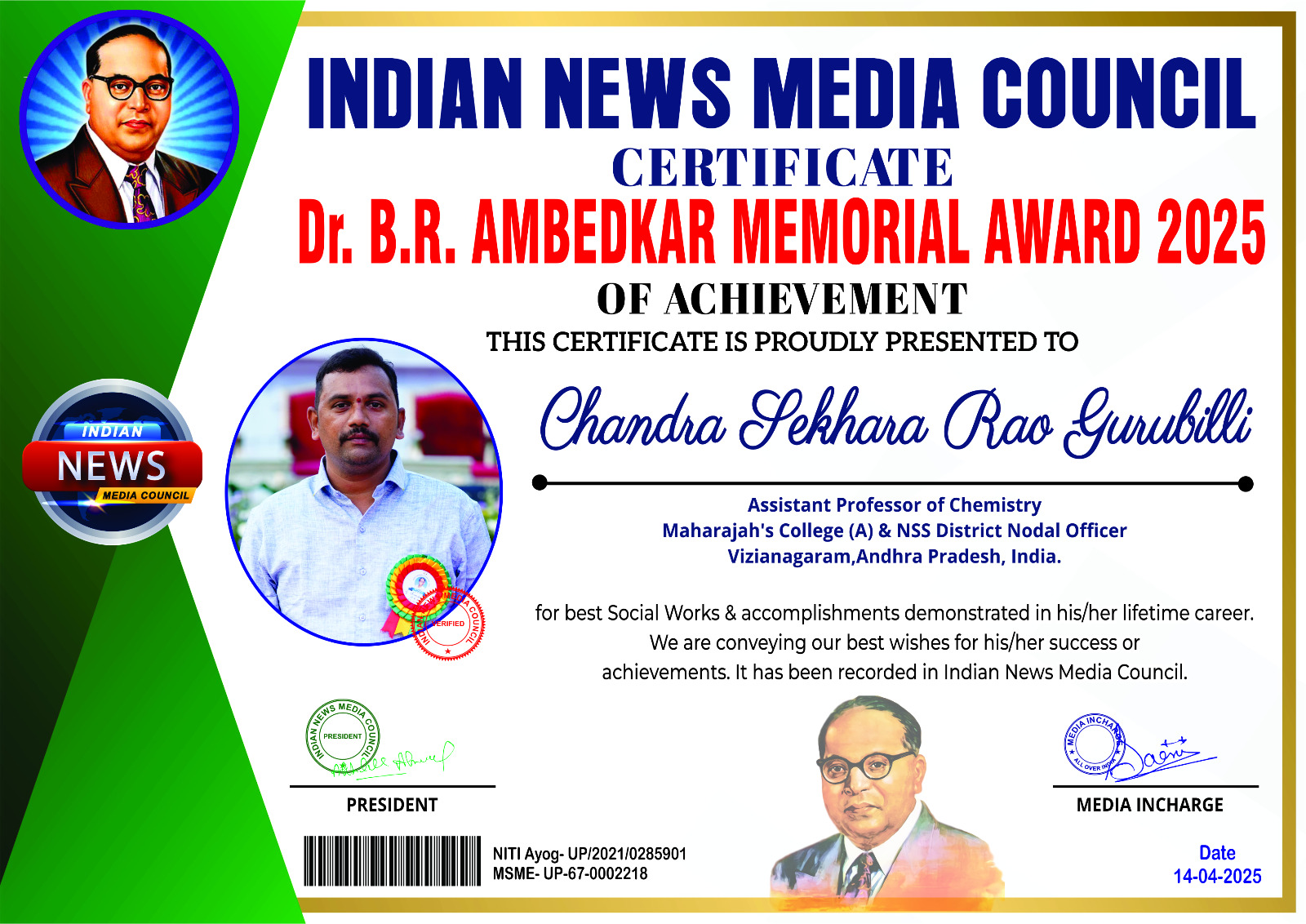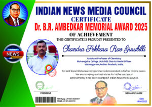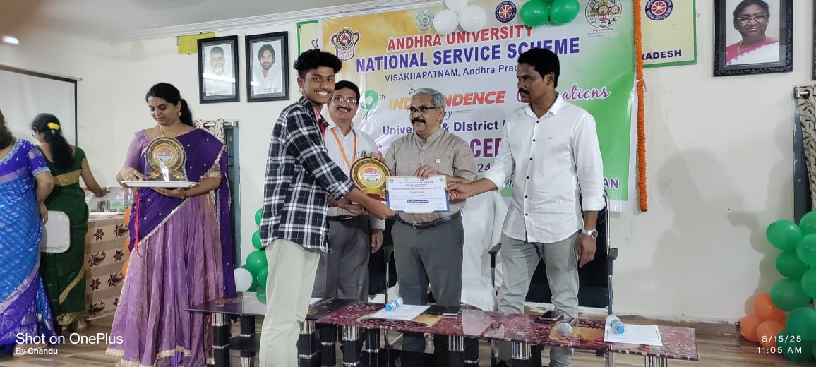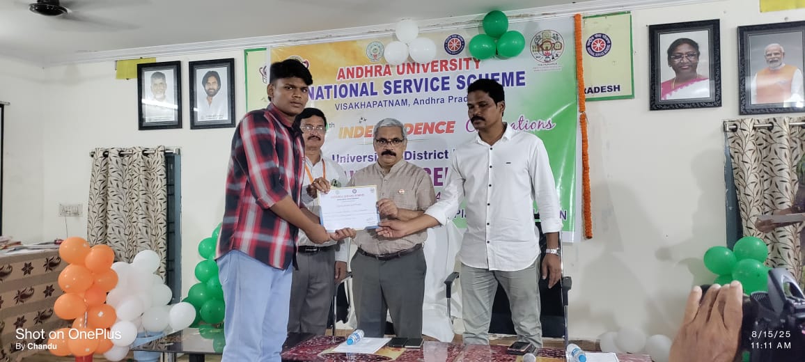 Mr. G. Harish, III B.Sc ( Chemistry) & NSS Unit-6 Volunteer has received District level best NSS Volunteer Award from Andhra University NSS Cell, Visakhapatnam on 15-08-2025. Received this award from the hands of excellence Prof.G. P. Raja Sekhar, Vice-Chancellor, Andhra University. |